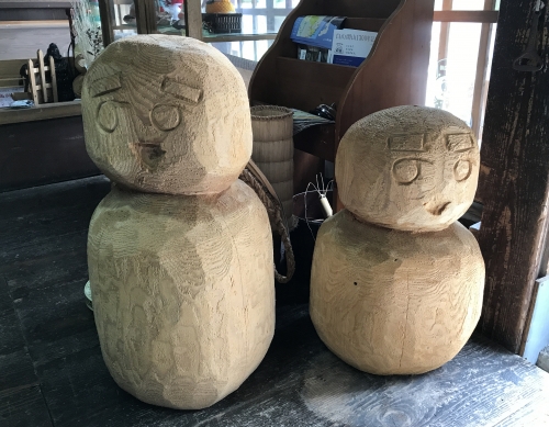 カフェの玄関ではかわいい雪だるまグッズが販売され、かわいい雪だるまならぬ木だるまがお迎えしてくれます。