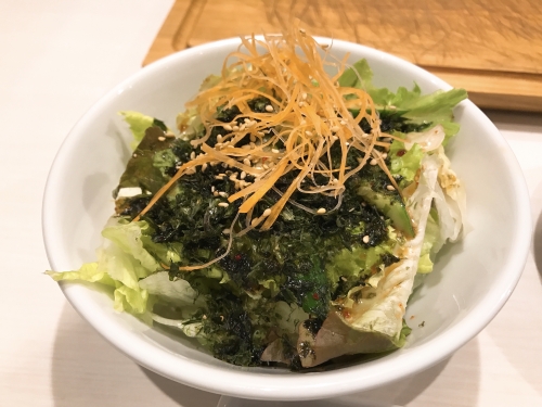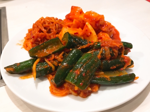 新鮮な野菜サラダからスタート。ドレッシングがとても美味です。キムチはきゅうり、大根、人参の3種類。辛さと、野菜のシャキシャキ感がたまりません。