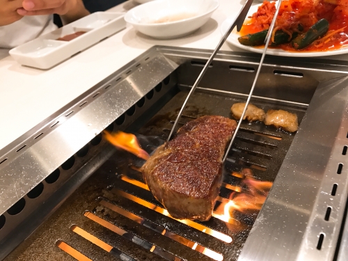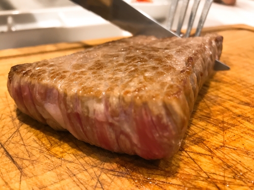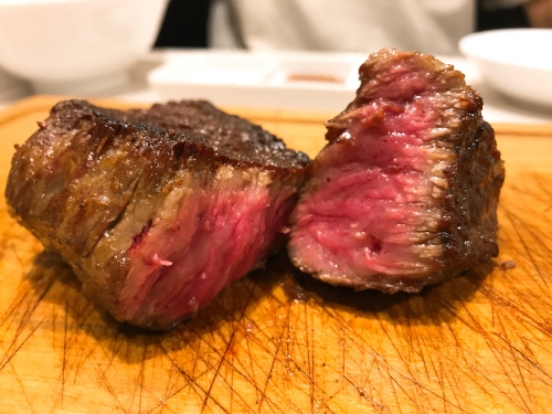 お肉の内容は日替わりだそうで、この日はリブロース、イチボ、カタロース、ソトヒラでした。美しそうなサシが入ったお肉を、自分で焼いていきます。焼き加減はお店のおすすめ、レアでどうぞ。