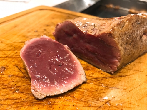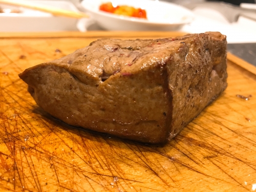 レバーステーキ。レバーが塊で出されることはなかなかないでしょう。さっと火を通して炙りましょう。新鮮なレバーは柔らかく、口に入れるとトロッととろけます。これは感動です。