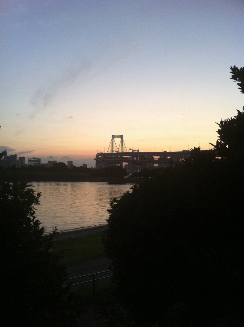 ライトが灯る橋を背に、お台場へ