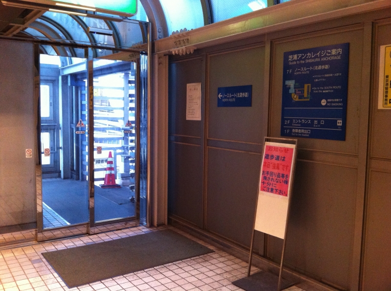 芝浦側からレインボーブリッジを望むと、ぐるりと大きな円をかいて橋につながるルートが見えます。そのルートと橋のつなぎ目の下辺りに、遊歩道の入口があります。入口の前には営業時間などを掲示する案内板がありますので、まずは当日の遊歩道の開放時間などを確認します。