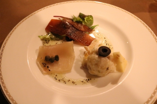 ディナークルーズには料理のコースによっていくつかのプランがあります。写真は、今回利用した「恋人の聖地カップルプラン」の中のイタリア料理のコースの一部ですが、オードブル、パスタ、メイン、デザート、パン、コーヒーまたは紅茶と1ドリンクが楽しめます。クルージングの金額は、料理のコースによって異なりますのでHPよりご確認下さい。