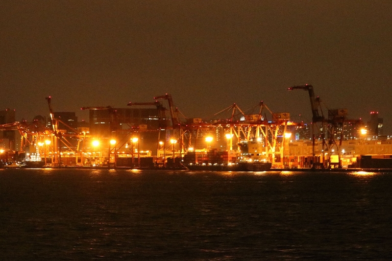 レインボーブリッジを抜けるとコンテナヤードが現れます。コンテナヤードでは、工場夜景でも人気スポットの1つとなっているガントリークレーンを見る事ができます。ガントリークレーンとは、レール上を移動可能な構造の橋脚型の大型クレーンです。