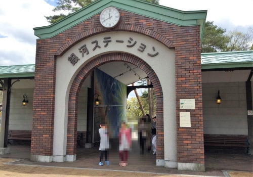 童話村のエントランスは、石造りのゲート「銀河ステーション」です。実際に乗って写真が撮れるミニSLなど、『銀河鉄道の夜』にちなんだスポットが多くあります。