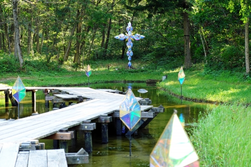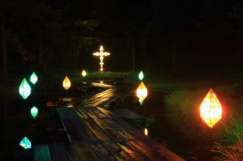 イベント期間中のみ「山野草園」の池に登場する十字架は、『銀河鉄道の夜』の終着駅・サウザンクロス(南十字星)をモチーフにしており、日没後は闇の中でぼんやりと浮かび上がる姿を披露してくれます。『どんぐりと山猫』にインスパイアされたオブジェは、きらきら輝くステンドグラスが印象的!
