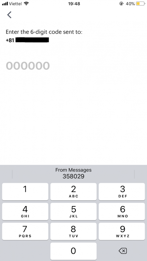 まずアプリをダウンロードしたら、個人情報などを登録していきます。電話番号を入力すると、左の写真のように確認画面がでてくるので、SMS(ショートメッセージ)に送られてくる認証番号を入力して登録を進めしましょう。登録する番号は勿論、日本で使っている自分の携帯電話番号でOKですが、SMSで送付される認証番号を受信できる環境にあることが条件となります。