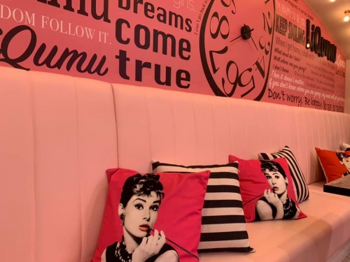 淡いピンクや濃いピンクを基調とした激カワ店内で、ソファや椅子、クッションなど、細部にわたってまでこだわりが感じられます。