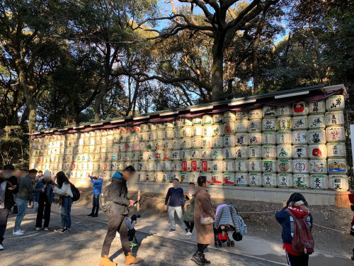 南参道のオススメスポットはこちらの酒樽とワイン樽です。明治神宮もの規模となると酒樽の数も日本最大級を誇り、ずらっと並ぶ姿に圧倒されてしまします。日本各地の日本酒メーカーや酒造家から奉献された酒樽の数はなんと216個もあるそうです。