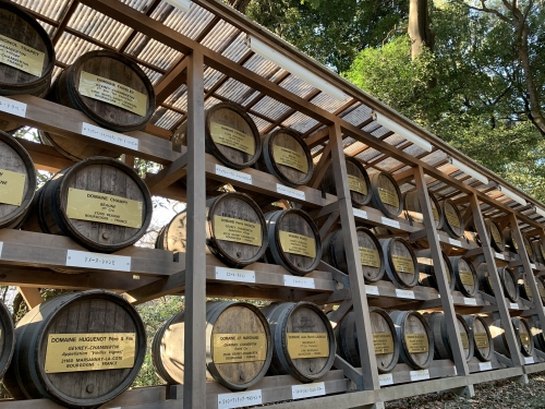 酒樽の正面には、日本でも珍しいワイン樽が置いてあります。フランスはブルゴーニュ地方の醸造元から届けられたものだとか。なぜ、ワインなのかというと明治天皇がワインがお好きだったから、という背景があるそうです。この、酒樽とワイン樽の場所はSNS映えの場所としても人気が高いです♪
