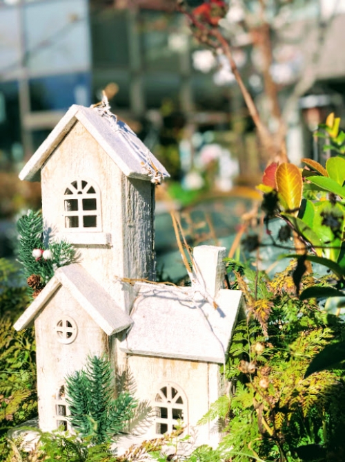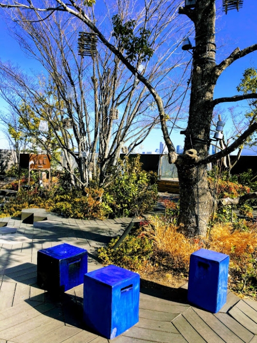 「おもはらの森」に出ると、ここが表参道とは思えないくらい静かで、緑豊かな空間が広がっています。街の喧騒がまるで嘘みたい!中央の休憩スペースには可愛らしいオブジェが飾られ、様々な色や模様の椅子が置いてあります。また、木々にも季節のオーナメントがぶら下げられ、思わず和んでしまいます。
