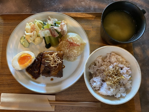 おすすめは、メイン1つ、サイド2つを選べるデリ・ランチ・プレート(¥1,600)。十六穀米、煮卵、マカロニサラダ、汁物も付いています。またメインは+¥700、サイドは+¥400で追加も可能です。