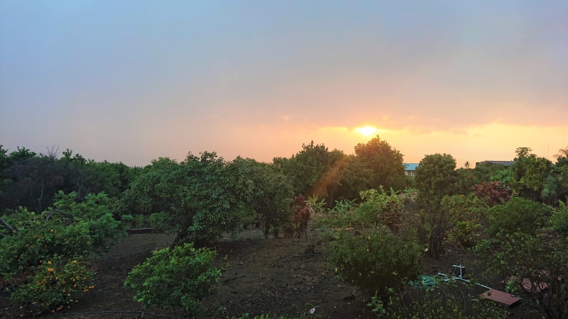 すべての部屋が海側に面しており、ラナイ(バルコニー)付きです。一段下がったところから、斜面に低木の果樹園が広がっており、鶏がいるくらいで人はまず見かけません。一階からでも果樹園の遠くに海を臨むことができます。天気が良ければ、海に沈む夕日を見ることができます。繁華街ではないので喧騒もなく、昼夜問わず静かに過ごすことができます。