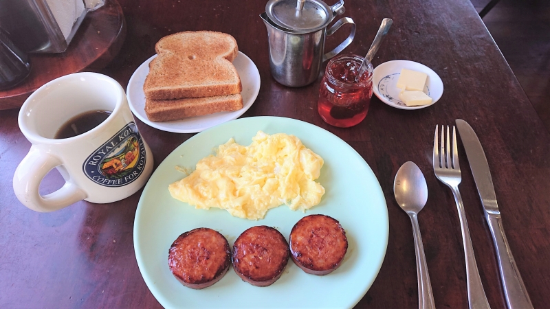 メインの肉料理は、リンクソーセージ(いわゆるソーセージ)、ポーチギューソーセージ(ポルトガル風ソーセージ)、ウィンナーソーセージ、スパム、ハム、ベーコンの中から選びます。そして、2個の卵は調理の仕方を伝えます。筆者はポーチギューソーセージとスクランブルエッグにしました。
