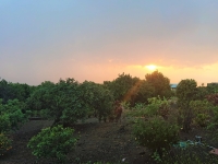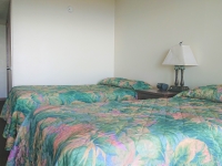 写真:トラベルライター 趣のあるフロント |  写真:トラベルライター シンプルな部屋にハワイ柄のベッド |  写真:トラベルライター 駐車場で撮った、果樹園の向こう側の海に沈む夕日 |