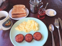 写真:トラベルライター 大衆食堂のような雰囲気のあるレストラン |  写真:トラベルライター ジュースかパパイヤを選べる朝食 |  写真:トラベルライター これぞオールドハワイ!!な朝食 |