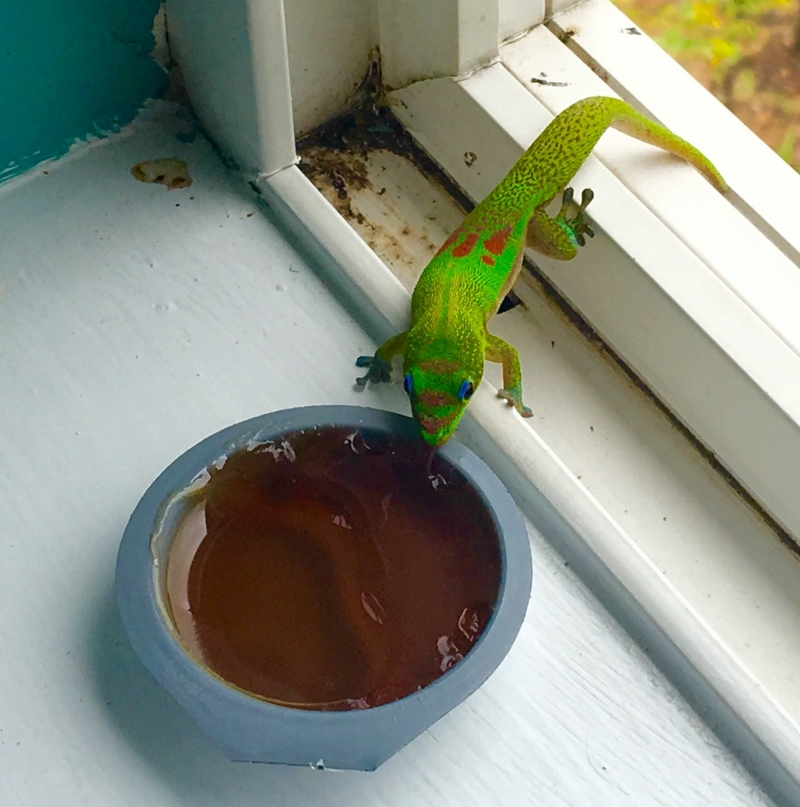 窓際には蜜が置かれており、ハワイに生息している緑色のヤモリが遊びにくる様子を写真に収めることもできますよ。