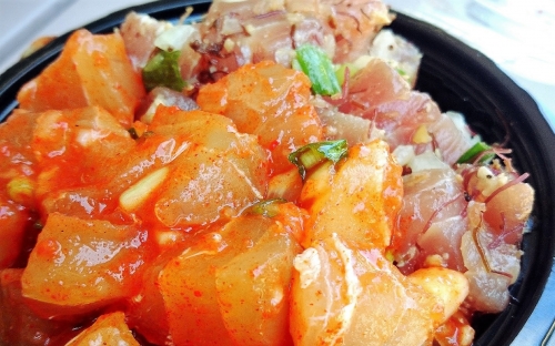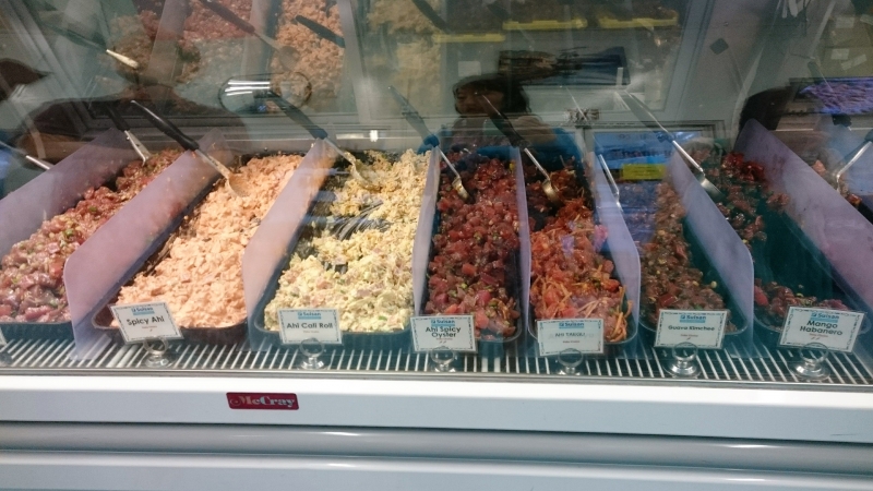 お店では調理用の魚の切り身も売っていますが、大半のお客さんのお目当てはポケ(ポキ)です。代表的なマグロをぶつ切りにしてしょうゆ漬けしたアヒポケはもちろん、スパイシーアヒポケや、タコ、カツオ、エビなど、様々な魚介の漬けが並んでいます。
