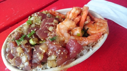 お店はリリウオカラニ・パーク敷地近くにあり、海岸沿いでもあるため、ハワイらしい穏やかな雰囲気が流れています。店舗外にはテラス席があり、できたてのポケ丼を買ってすぐ食べることができます。