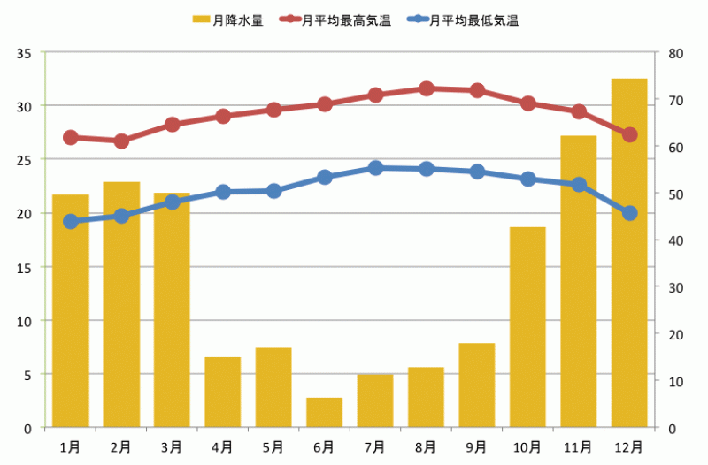 | 月平均最高気温(観測値) | 月平均最低気温(観測値) | 月降水量(平年値) | |