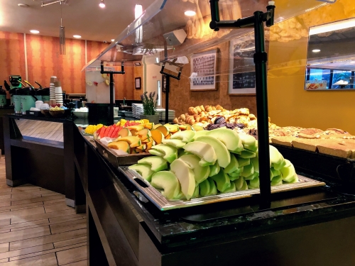 部屋は少々手狭ですが、1階ロビーの奥にはテーブルやソファーが設置されている広々とした空間があり、コーヒーや水が飲めるドリンクステーションが常備してあるので、ここでゆったりと旅の計画を練るのも◎また、フルーツたっぷりの朝食も魅力のひとつです。