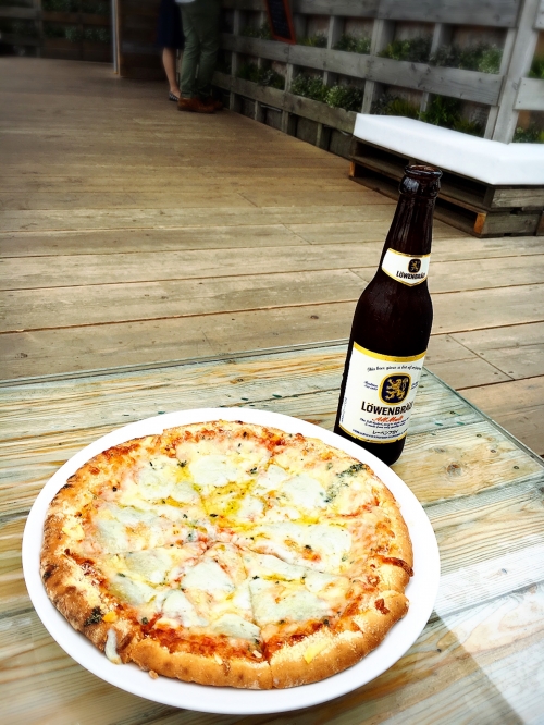 • 写真:トラベルライター4種チーズのピザ&レーベンブロイ(ビール)