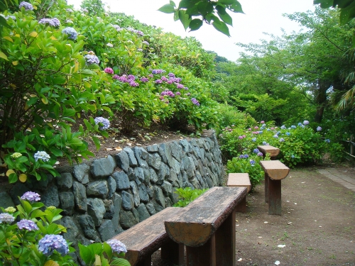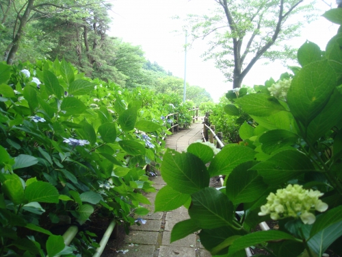 このあたりは土地の起伏が激しく、公園の入口でもすでにそれなりの坂の上にあります。入口からさらに階段を登ると、梅雨の時期には海とともにあじさいの風景が!