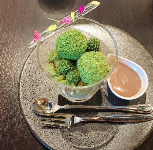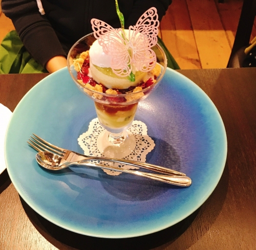 なんといってもここは繊細で芸術的なパフェがとっても素敵なんです!下の写真右は青リンゴと紅茶とハーブのパフェ(税込¥1,250)、左は杏とヨモギのパフェ(税込¥1,200)。他にも、季節によってさまざまなバリエーションのメニューが登場します。もちろん、味もとってもおいしい!