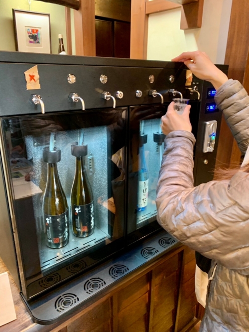 試飲機の前に来たらメダルを投入し、コップをセットして、試飲したい銘柄のお酒の上にある青色のボタンを押しましょう。一度ポチッと押せば1回分の量が自動で出るので、大切なお酒をこぼしてしまう心配はありませんよ。