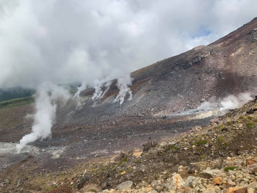 左側の地獄谷の噴煙を見ながら、慎重に一歩一歩登っていくと、ほどなくして6合目に到着です!