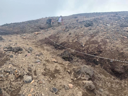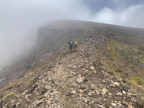 この日は途中から曇り始め、8合目手前で深い雲に包まれ、視界も悪くなっていきました。標高が高いこともあり、天気が変わりやすいので、装備を含め、十分に注意しましょう!