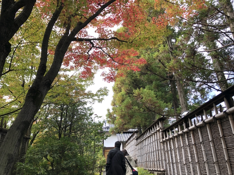 また、ここは他の庭と少しイメージが違うなと感じるのは、おそらく、周囲が漆喰の屋根付きの壁「築地塀」に囲まれているから。まっすぐ上に伸びる竹と、築地塀の対比が 山水画 を思わせる風景を作り出しています。