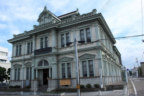 明治37年(1904年)に旧第五十九銀行の本店として建てられた洋館で、昭和47年(1972年)に国の重要文化財に指定されました。ルネッサンス様式の洋風建築に、防火のために日本の土蔵造りを取り入れた和洋折衷の造り。一階頭取室と二階小・大会議室の天井一面に貼られた金唐革紙(きんからかわかみ)が見事です。