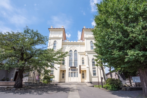 明治8年(1875年)に「弘前公会」の名前で創設されたプロテスタントの教会で、現在の教会堂は三代目。明治39年(1906年)に完成しました。フランスのノートルダム大聖堂をモデルにしたと言われており、ふたつの塔をもつゴシック様式の木造2階建。