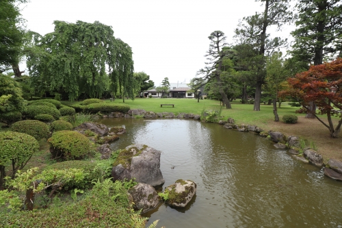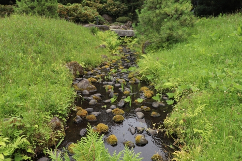 滝から流れ出た水はへと向かいます。そのため、庭園内には大きな池があります。