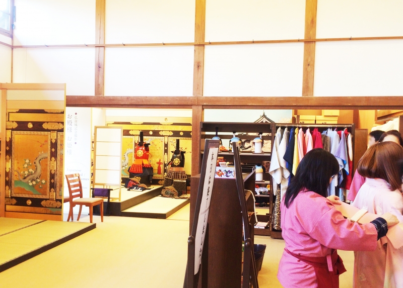 料金(2017年4月現在):着物500円、甲冑・打掛1,000円(写真フレーム付きの記念写真は、別途500円)