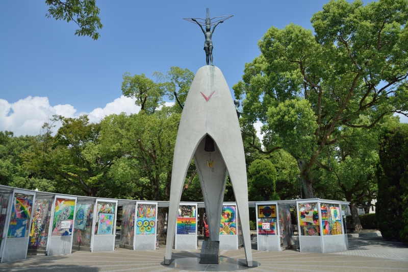 年間を通じて、世界中の人々からたくさんの千羽鶴が捧げられていることから、「千羽鶴の塔」とも呼ばれています。頂上には折り鶴を持つ少女、側面左右の二体は少年と少女で明るい希望を象徴したブロンズ像で、9mの大きさです。