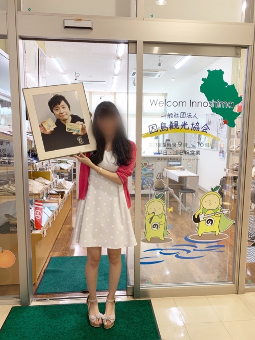お願いをすれば、観光協会の方が撮影をしてくださるので、一人で因島に訪れる方も、昭仁さんの写真と一緒に記念撮影ができますよ。