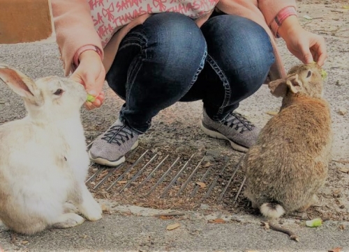 そのほうがたっぷり楽しめるというのも理由の一つですが、一番の理由は「うさぎのエサへの関心度」です。大久野島には唯一「休暇村」というホテルがあります。そこでの滞在客はもちろん朝からウサギにエサを与えるでしょうし、日帰り客も朝から大勢やってきてはエサを与えます。