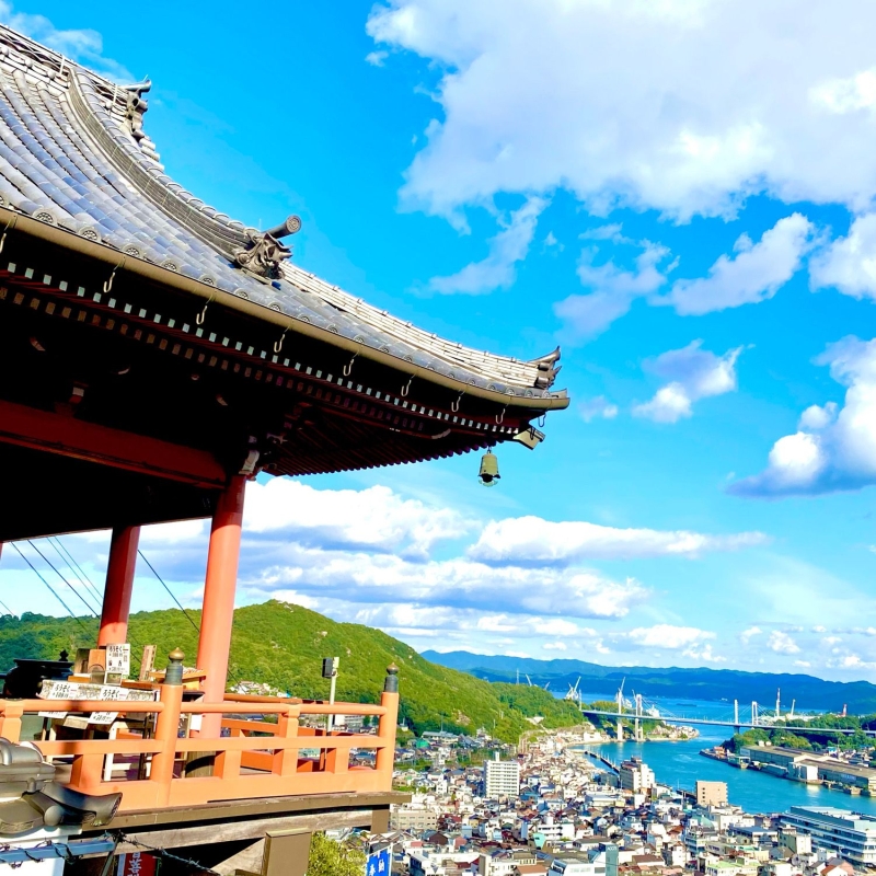 大同元年(806年)創建と、約1,200年の長い歴史を持つ由緒あるお寺。尾道の街を見下ろす高台に位置しており、ロープウェイに乗って訪れることができます。断崖絶壁にへばりつくように建てられた舞台造りの本堂は、別名”赤堂”とも呼ばれ、その朱色が印象的。またくさり山をのぼる「鎖山修行」や、高さ約7mの岩に直径約2mの円形が削られている「鏡岩」なども見どころです。