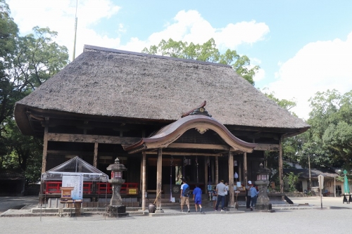 創建は806年。現在の建物は1609年から4年かけて造営されたものです。本殿、廊、幣殿、拝殿、楼門と五棟一連の御社殿は黒を基調とし、桃山様式と呼ばれる技法で建てられています。その一番の特徴は茅葺屋根。一連の御社殿が同時期のものであることは大変貴重で、平成20年、熊本県内では初めて国宝に指定されました。