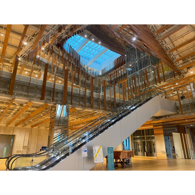 世界的な建築家である隈研吾氏が設計した「TOYAMAキラリ」内にある「富山市ガラス美術館」。木のあたたかみを感じるTOYAMAキラリの館内は、2〜6階まで吹き抜けでとても開放的な空間です。