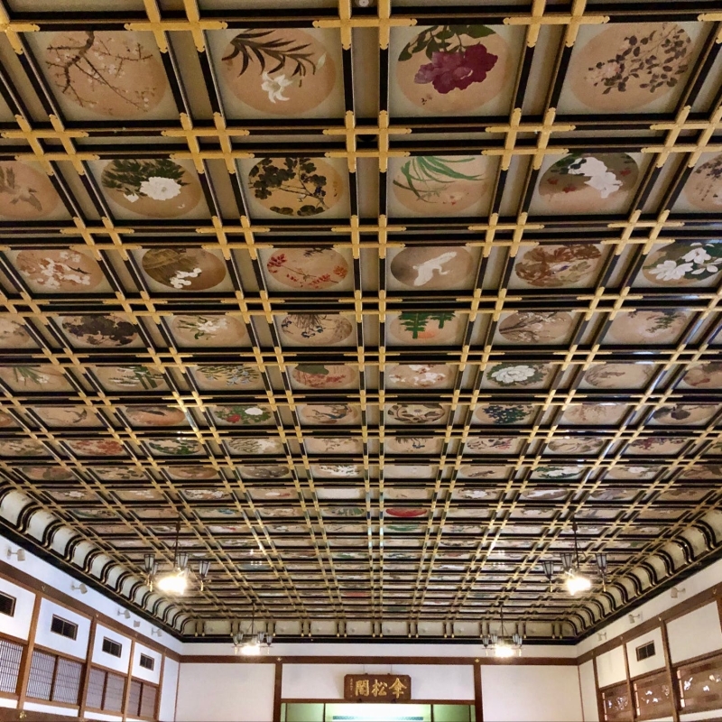 見どころのひとつが、拝観ルートになっている傘松閣(さんしょうかく)2階の「絵天井」。230枚もの美しい絵が天井一面描かれており、うっとり眺めたくなります。