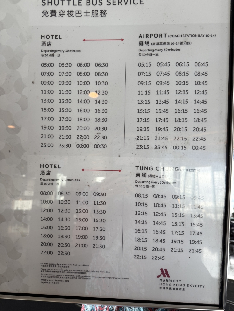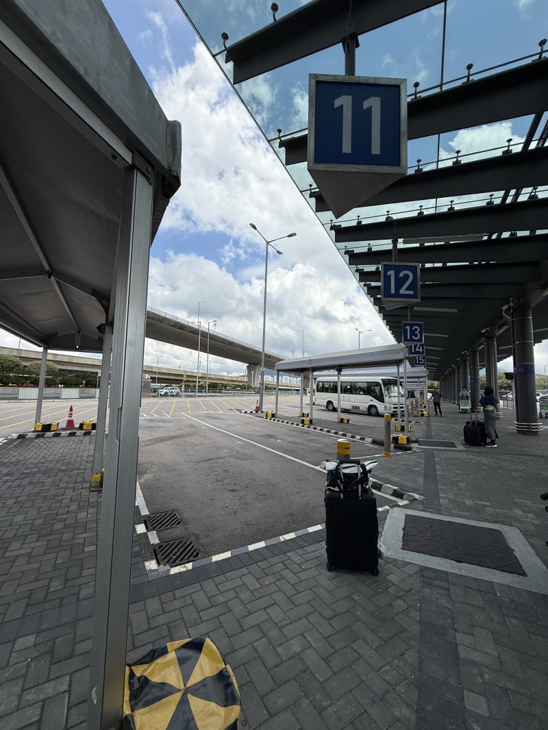 エレベーターで1Fへ行きタクシー乗り場の横がシャトルバス乗り場になります。香港スカイシティ・マリオット・ホテルはシャトルバス乗り場11〜14に止まります。バスの横または正面にホテル名が書いてあるので、すぐにわかります。香港スカイシティ・マリオット・ホテルは大きくて綺麗なバスになります。