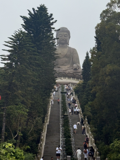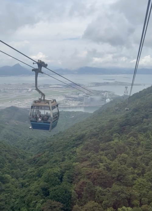 東涌(トンチョン)駅からゴンピン360ケーブルカーが出ているんです。香港のビル群とは少し違う自然豊かな景色が楽しめます。約25分乗ったら、ゴンピンビレッジに到着。飲食店や土産物店を進んでいくと天壇大仏や宝蓮禅寺があるんです。世界で2番目に大きな屋外大仏は圧巻!