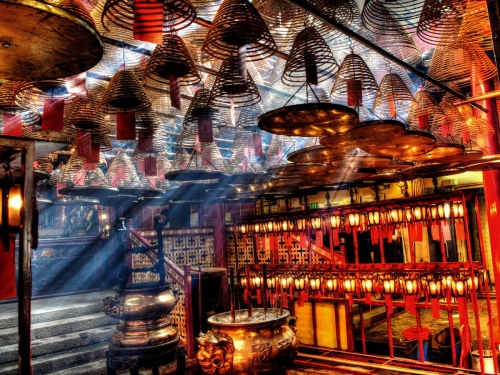 文武廟は香港最古の道教寺院で、都会的な香港の街中にひっそりと佇んでいます。中に入ると、天井に吊るされた渦巻き線香がずらり!寺院の外の喧騒とは別世界が広がります。建物の色使いも日本の寺院とは異なり、赤が映えるのが印象的です。