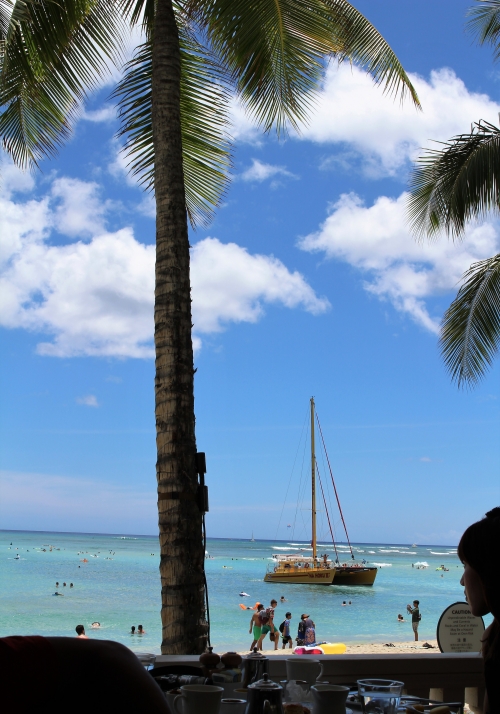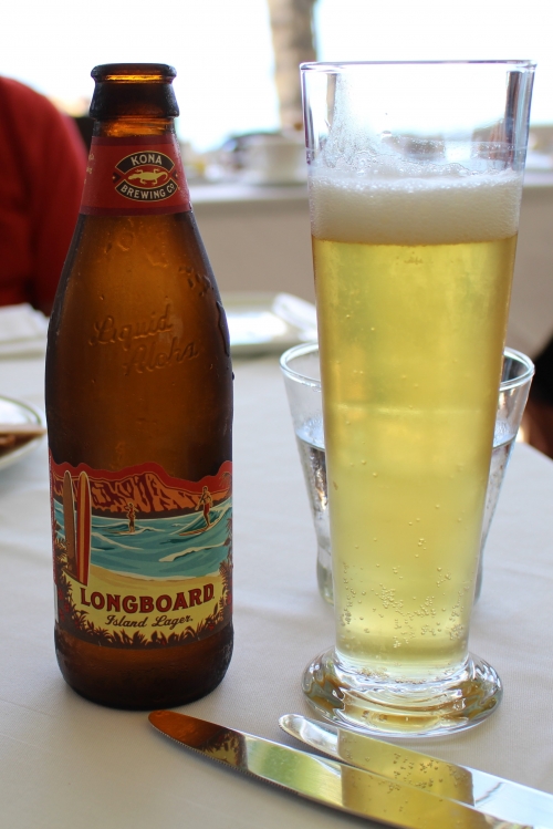 ハワイの地ビールである、コナビール【ロングボード】(US$7/約760円)で乾杯♪心地よい風に吹かれてまったりすごしていると、いつのまにか沖からヨットが近づいてきていました。テラス席の前浜は、様々なマリンアクティビティの起点でもあるため、たくさんの人で賑わっています。