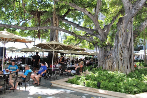 バニヤンツリーの立派な枝ぶりが、涼しい木陰を生み出している中庭。こちらは「ザ・ベランダ」ではなく、「ザ・ビーチ・バー」というバーのお席です。ハワイアンミュージックのライブ演奏を聴きながら、トロピカルドリンクや軽食がいただけます。