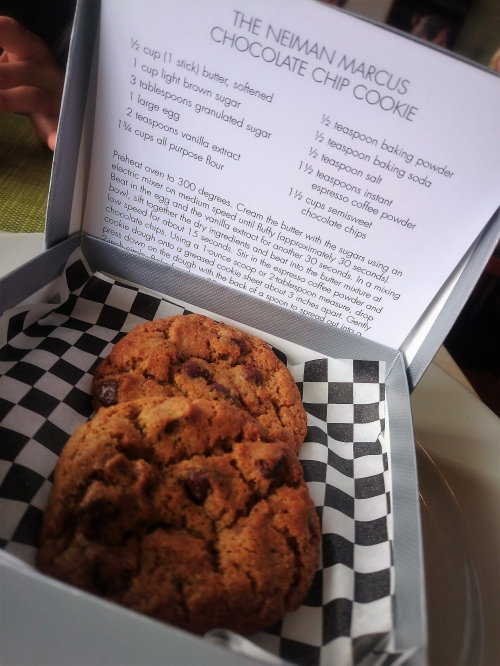 マリポサでは、デザートの1つにニーマンマーカスのチョコチップクッキーがあります。このクッキーは箱入りで運ばれてきて、希望すれば温めてもらうこともできます。
