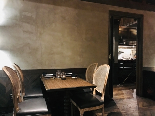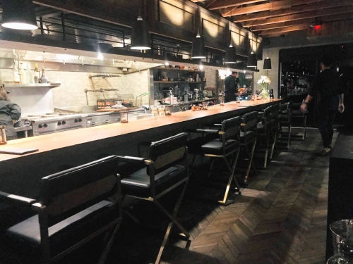 その奥にはオープンキッチン席と、テーブル席があります。店内は暗い照明で、どこかムーディーながら非常に大人な雰囲気が流れる空間。